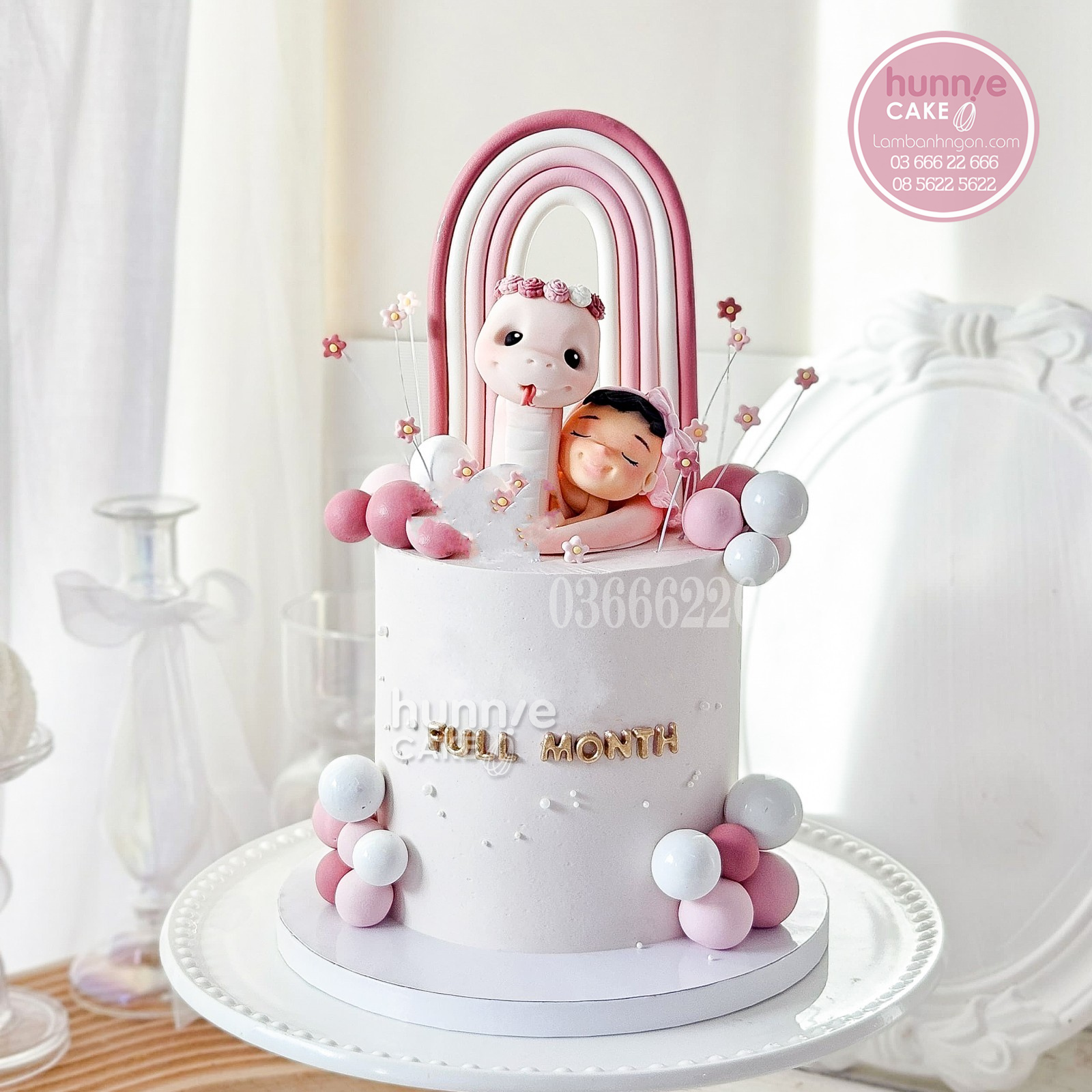 Chi tiết trang trí: Bong bóng tròn, hoa nhỏ, cầu vồng pastel, dòng chữ “Full Month” mạ vàng tinh tế.