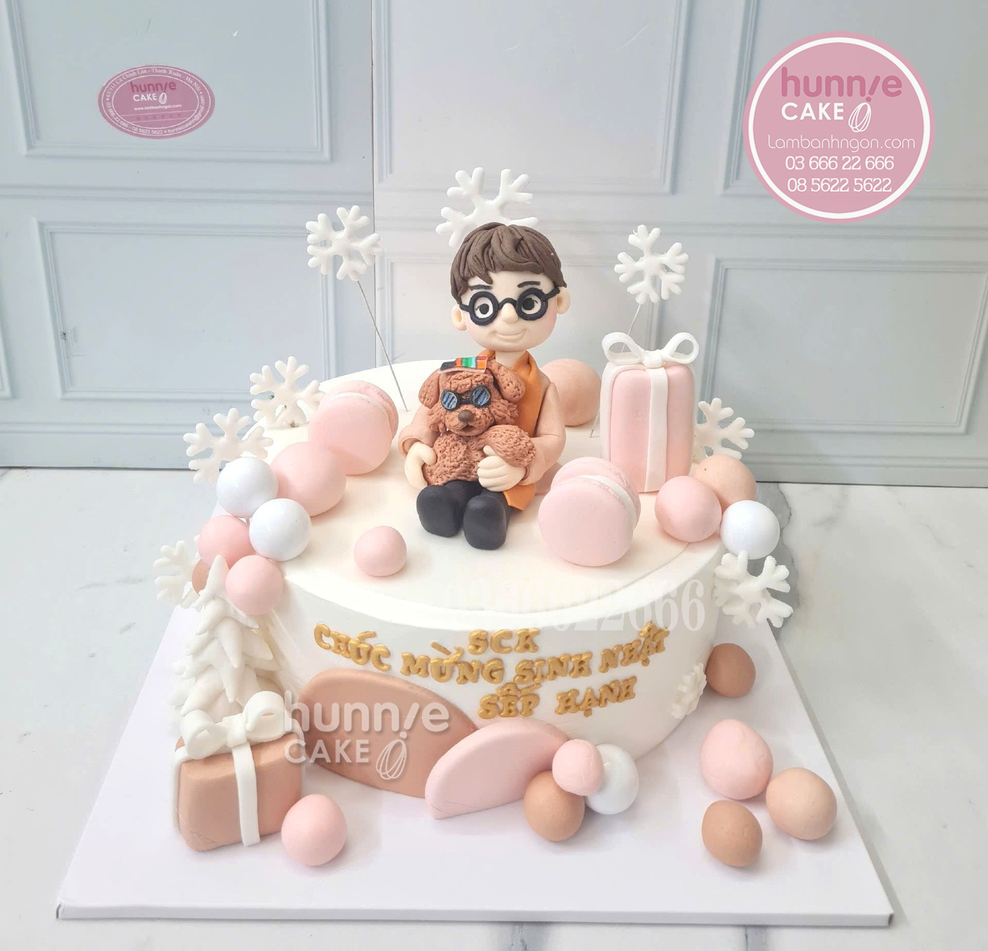Chi tiết thiết kế ấn tượng Bánh sử dụng tông màu trắng, hồng và beige trang nhã. Nhân vật chibi được nặn tay khéo léo dựa trên hình ảnh thật của sếp, đi kèm là các phụ kiện như hộp quà, bông tuyết và macaron cao cấp. Sự kết hợp này tạo nên vẻ đẹp hiện đại, phù hợp với không gian văn phòng sang trọng.