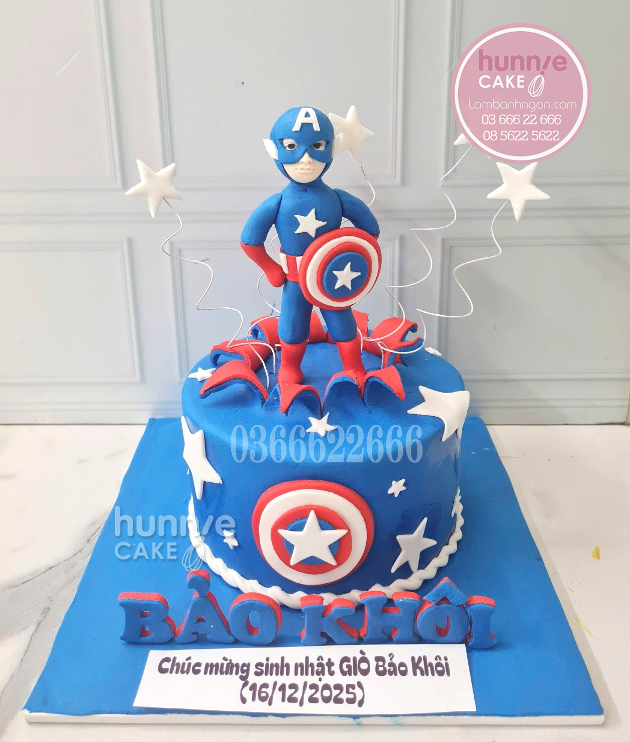Địa chỉ đặt bánh sinh nhật Captain America đẹp tại Hà Nội, bánh sinh nhật siêu anh hùng Captain America cho bé trai Bảo Khôi, mẫu bánh sinh nhật Đội trưởng Mỹ mới nhất 2026.