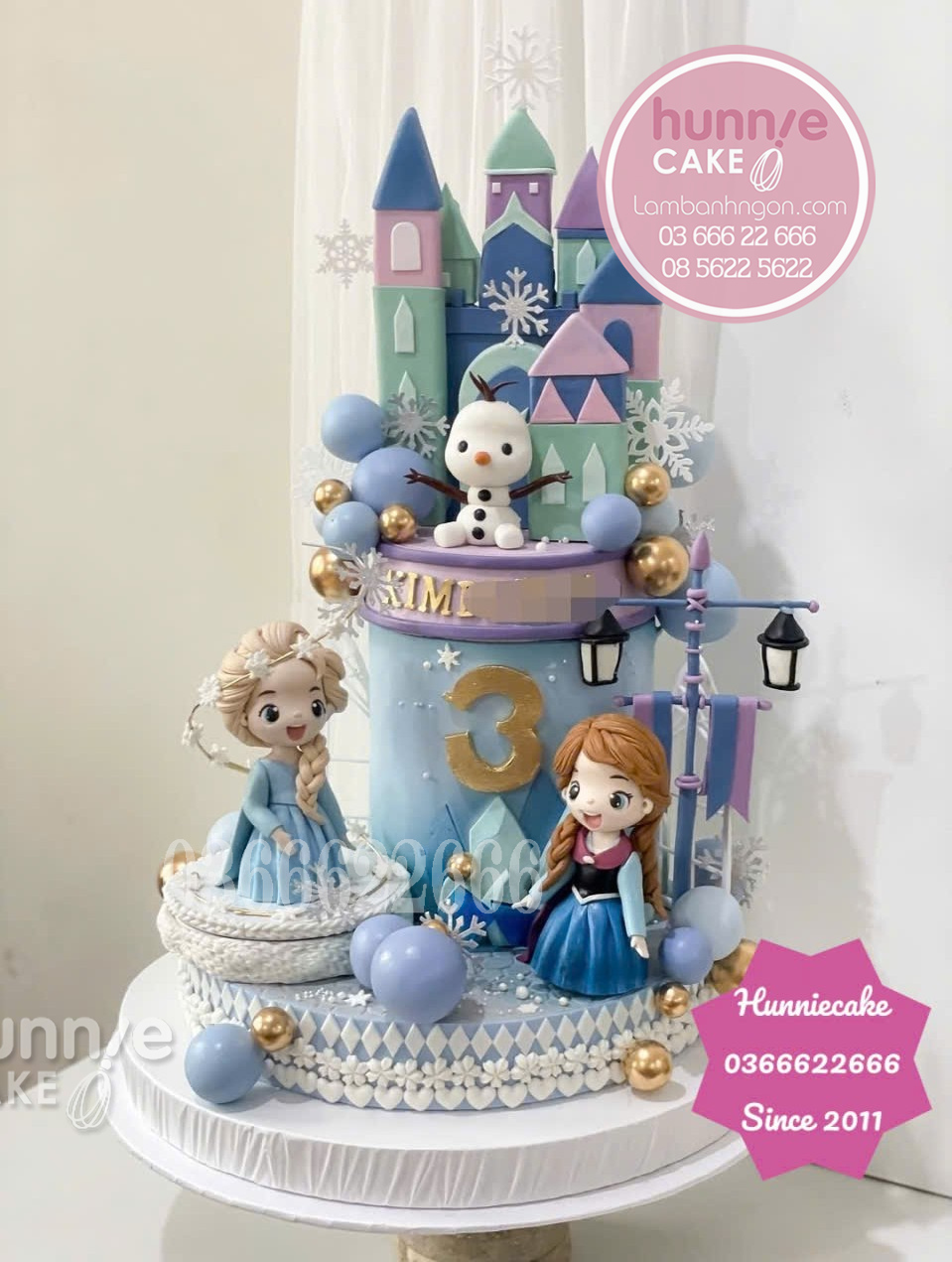Thiết kế lấy cảm hứng từ bộ phim Frozen với hình ảnh Elsa, Anna và lâu đài băng, tạo nên một không gian cổ tích đầy cuốn hút. Tông màu xanh tím pastel giúp chiếc bánh vừa sang trọng vừa phù hợp với không gian tiệc sinh nhật.