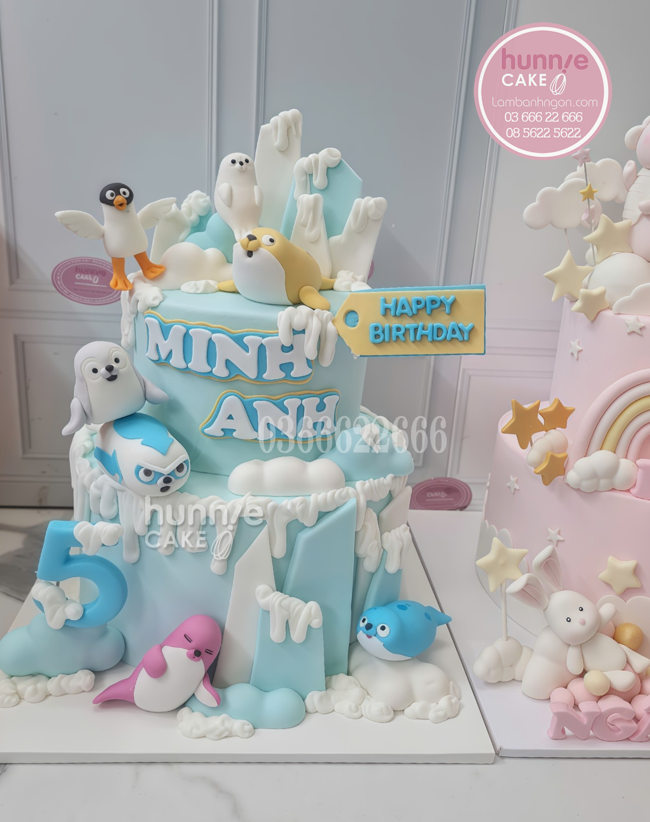 Từ khóa theo hình dáng và chi tiết: Bánh sinh nhật Sealook 2 tầng, bánh kem hải cẩu 3D, bánh sinh nhật màu xanh pastel.