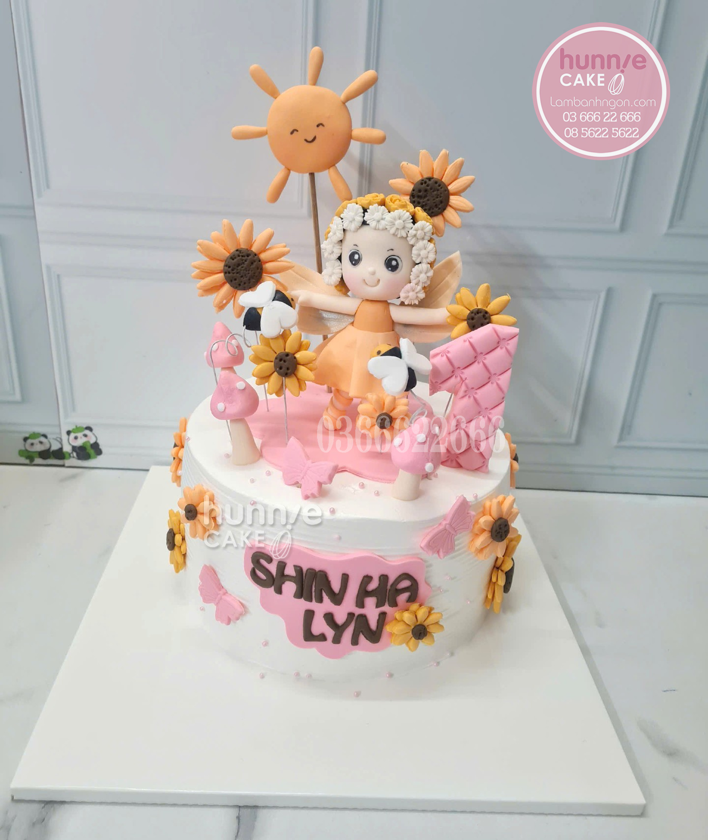 Từ khóa theo hình dáng và chi tiết: Bánh kem hoa hướng dương, bánh sinh nhật mặt trời, bánh gato nặn hình bé gái, bánh kem màu vàng hồng.