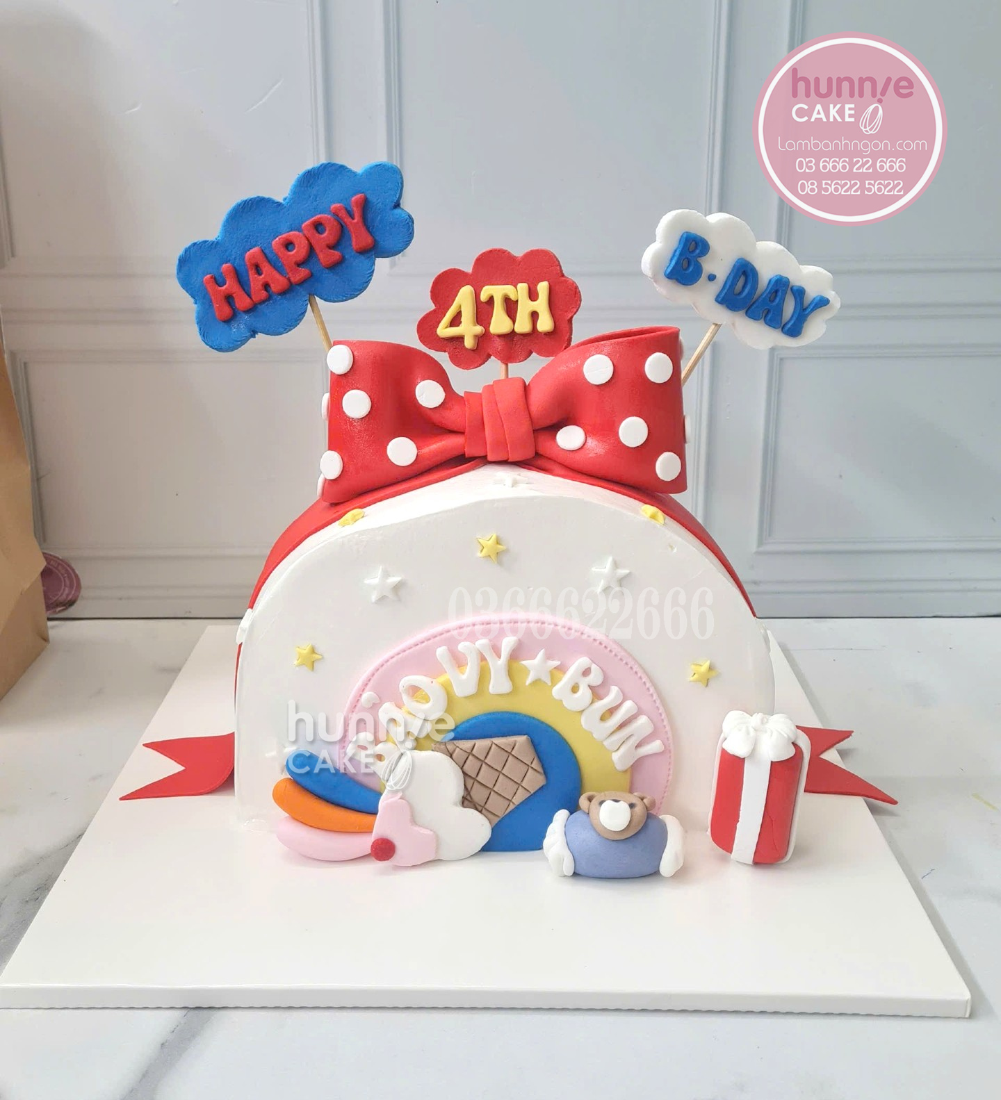 Bánh sinh nhật nơ đỏ và cầu vồng tặng bé gái 4 tuổi Hunnie cake, địa chỉ mua bánh kem cầu vồng cho bé gái tại Hà Nội, mẫu bánh sinh nhật nơ đỏ đẹp và sang trọng nhất.