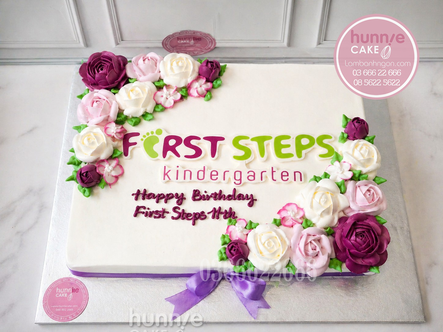 Sử dụng tone trắng chủ đạo kết hợp với hoa trang trí thủ công, chiếc bánh mang lại cảm giác nhẹ nhàng, tinh tế nhưng vẫn đủ nổi bật. Nội dung trên bánh có thể tùy chỉnh theo tên công ty, số năm kỷ niệm hoặc thông điệp riêng, giúp doanh nghiệp tạo dấu ấn riêng trong sự kiện.