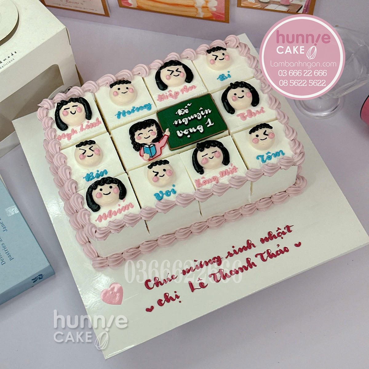 Bánh sinh nhật chia miếng vẽ hình cô giáo bảng đen và học sinh tổng kết cuối nămGiá: 550.000 VNĐ