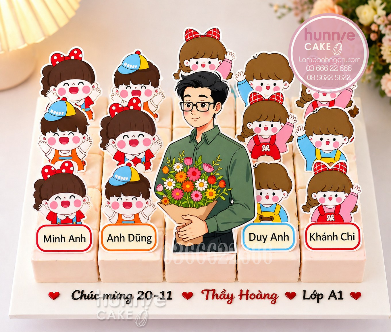 Tại Hunnie Cake, mỗi chiếc bánh đều được thiết kế theo yêu cầu riêng. Khách hàng có thể tùy chỉnh số lượng miếng, nội dung, màu sắc và hình ảnh để phù hợp với từng lớp.