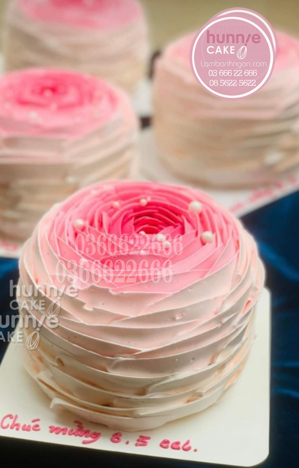 Chiếc bánh này có thiết kế tinh tế, lấy cảm hứng từ vẻ đẹp của một bông hồng khổng lồ. Phần kem bên ngoài được phủ một cách mềm mại, với từng lớp như cánh hoa xếp chồng lên nhau, mô phỏng hình dáng của bông hồng đang nở rộ. Màu hồng pastel của hoa hồng tạo nên sự nhẹ nhàng, nữ tính và rất thích hợp để tặng cho những dịp đặc biệt như ngày 8 tháng 3 - Ngày Quốc tế Phụ nữ, hoặc cho một ngày sinh nhật lãng mạn.