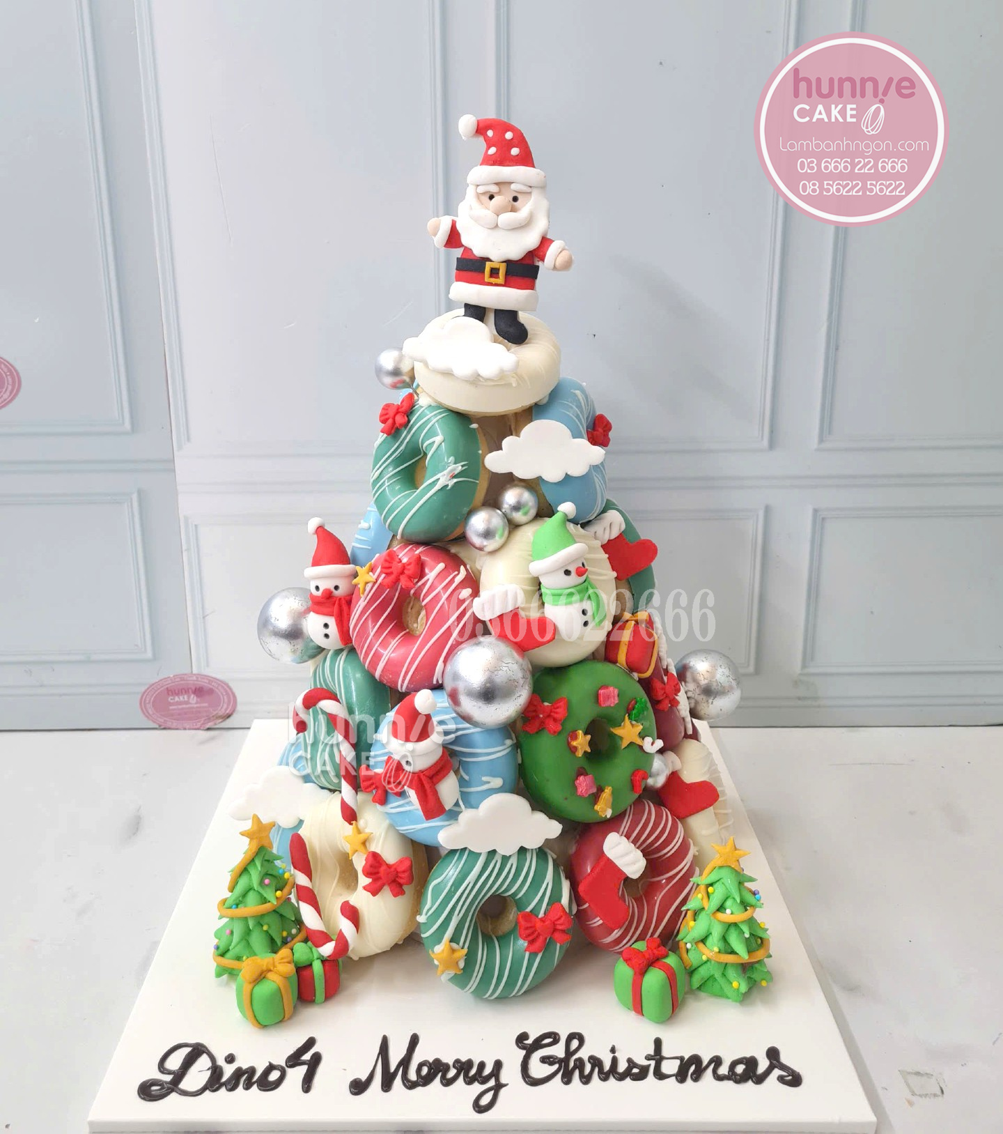 Tháp bánh donut 3D, tạo hình ông già Noel bằng đường, bánh kem người tuyết, trang trí donut màu sắc, bánh hình cây thông Noel, phụ kiện Giáng sinh thủ công, bánh sinh nhật donut cho bé.