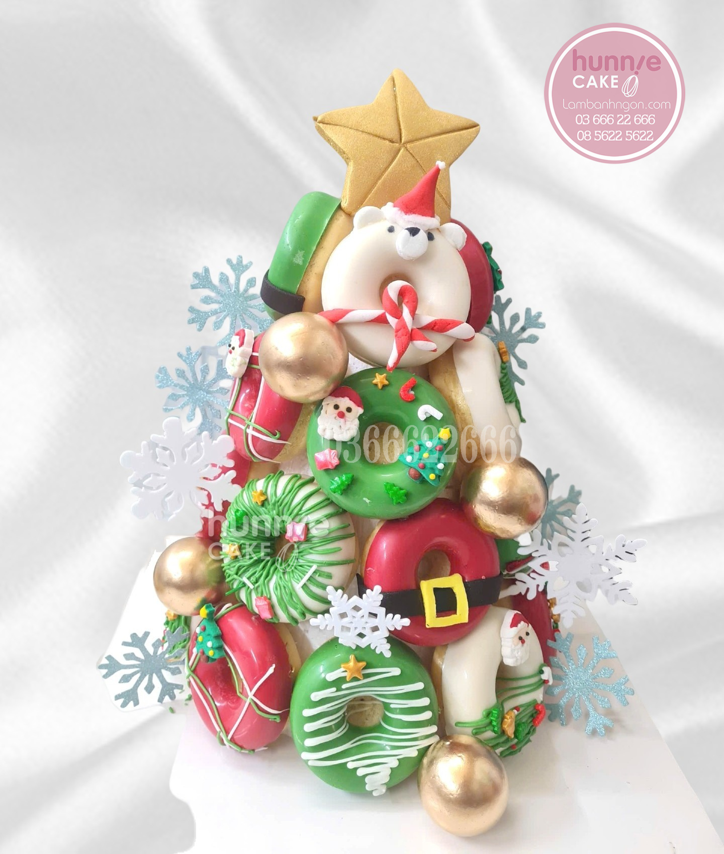Tháp bánh được xếp từ hàng chục chiếc donut mini mềm mịn, trang trí theo phong cách giáng sinh hiện đại. Các họa tiết như ông già Noel, gấu bắc cực, cây thông và bông tuyết đều được nặn thủ công từ nguyên liệu cao cấp, đảm bảo độ sắc nét và màu sắc tự nhiên. Những quả cầu vàng và ngôi sao đỉnh tháp tạo nên vẻ ngoài lộng lẫy, phù hợp cho không gian tiệc sang trọng tại nhà hoặc trường học.