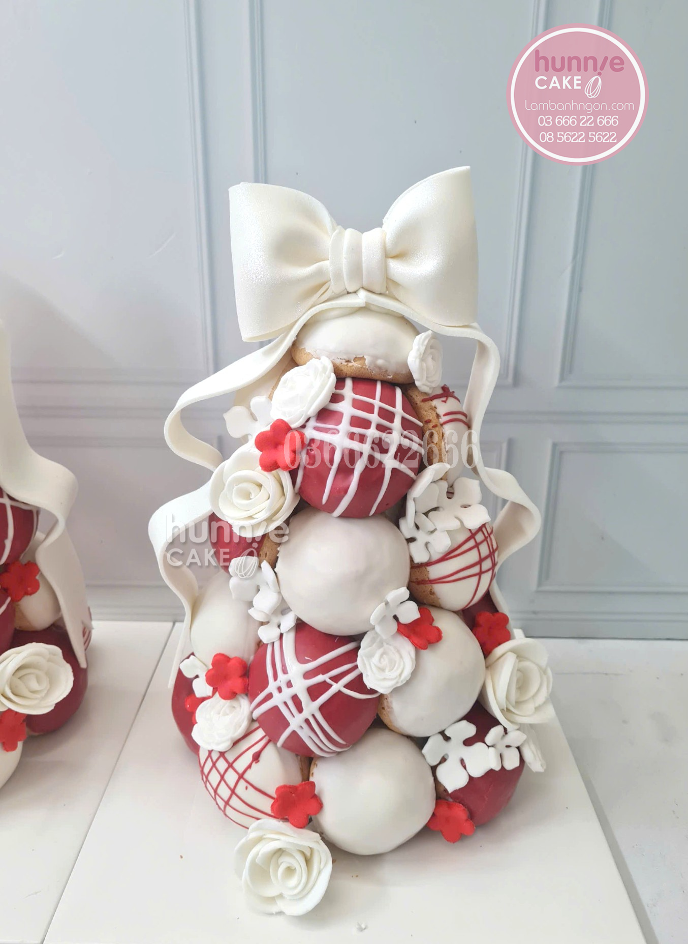 Tháp bánh được tạo hình thủ công tỉ mỉ với cấu trúc nón vững chãi. Điểm nhấn nổi bật nhất là sự phối hợp màu sắc tương phản giữa đỏ và trắng, tạo hiệu ứng thị giác cực kỳ bắt mắt. Những chi tiết trang trí như hoa hồng fondant, bông tuyết và chiếc nơ trắng bản to được thực hiện chau chuốt, mang lại vẻ đẹp quý phái cho bàn tiệc sinh nhật.