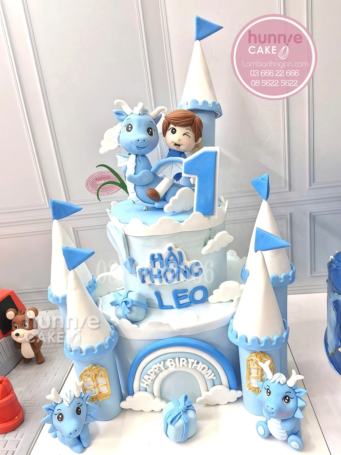 bánh sinh nhật 2 tầng lâu đài rồng bé trai 1 tuổi hoàng tử, bánh thôi nôi chủ đề lâu đài cho bé trai, bánh sinh nhật fondant rồng xanh tại Hà Nội, mẫu bánh hoàng tử bé trai đẹp nhất, bánh sinh nhật bé trai 1 tuổi sang trọng từ Hunnie Cake