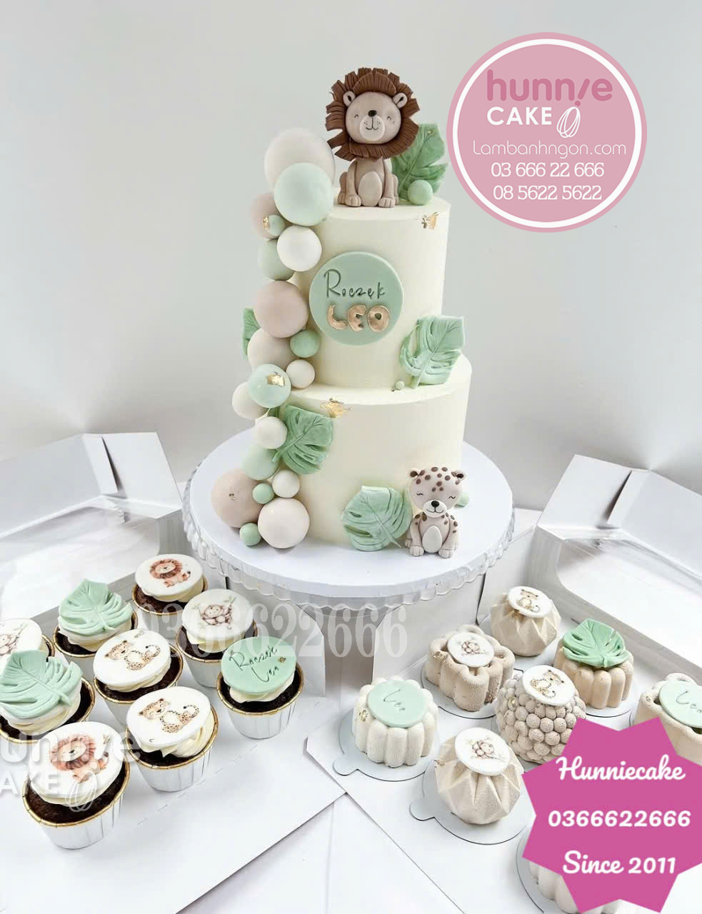 Thiết kế lấy cảm hứng từ rừng xanh với hình ảnh sư tử và các chi tiết thiên nhiên như lá, màu xanh pastel nhẹ nhàng. Điểm đặc biệt là sự đồng bộ giữa bánh chính và các bánh nhỏ đi kèm, giúp bàn tiệc trở nên đẹp và chuyên nghiệp hơn.