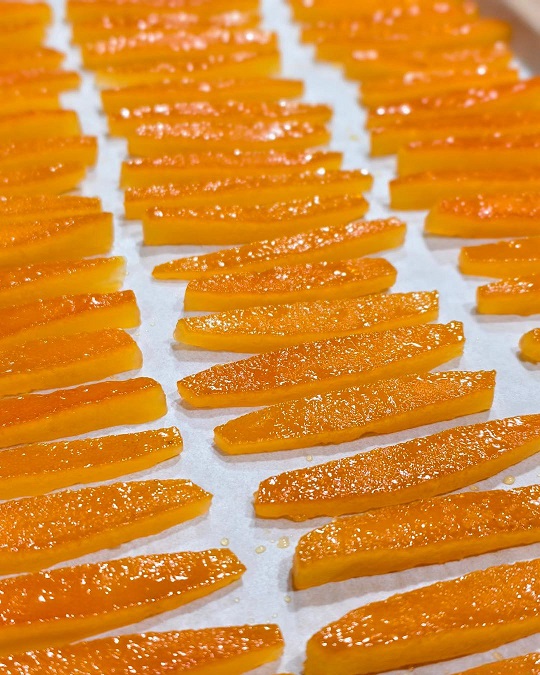 6. Khi vỏ cam đã trong, ngọt vừa đủ thì phơi vỏ cam dưới quạt gió hoặc tủ lạnh có quạt gió.