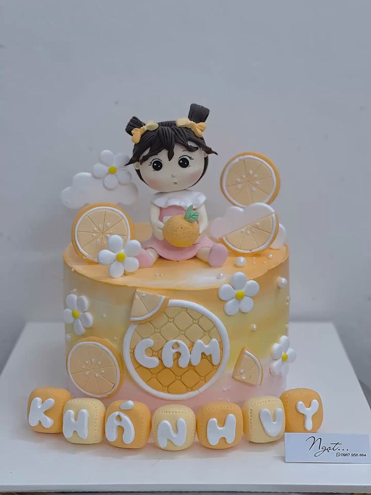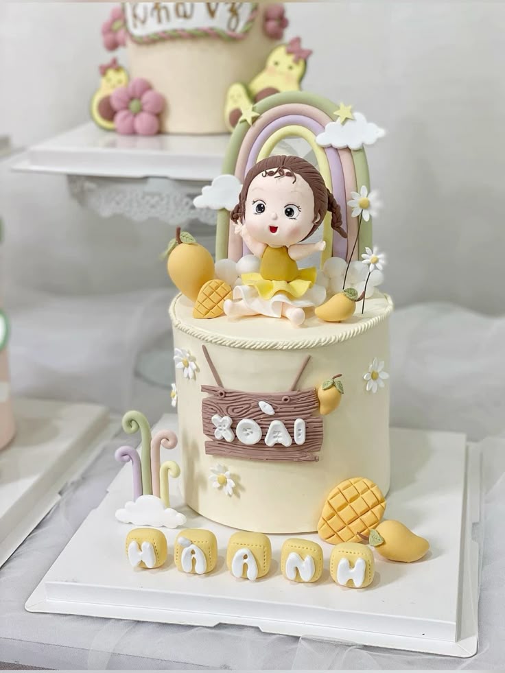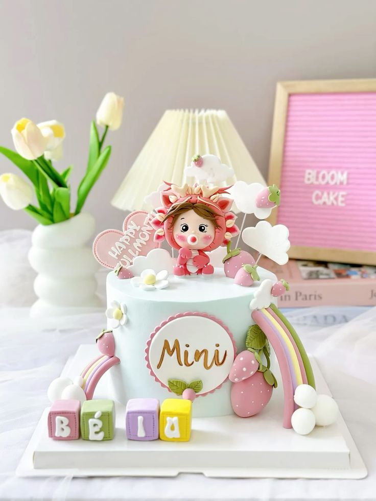 Nếu mẹ thích phong cách tươi mới, có thể chọn bánh bé Cam, bé Xoài, hay chủ đề dâu tây, hoa cỏ.